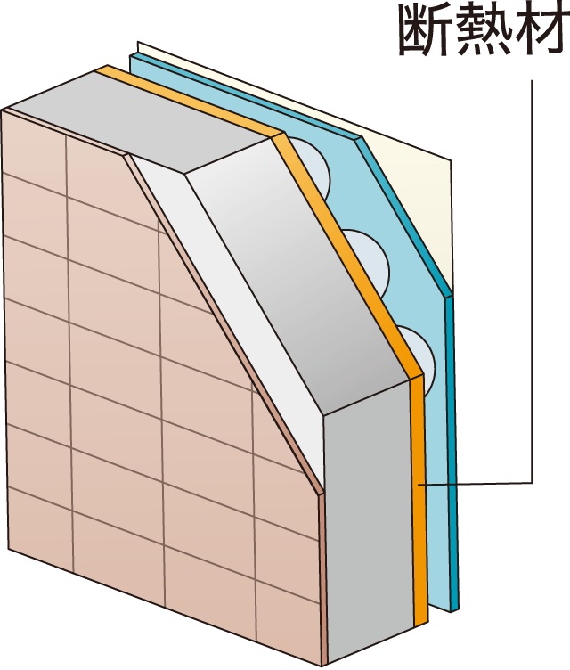 遮音性や結露、断熱性を考え、住戸部外部に面した壁のコンクリート厚は約150㎜以上、またはALC100㎜を採用。さらに磁器質タイル(または吹付けタイル)で耐久性を高めた外壁は、断熱材を含めた構造としています。