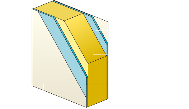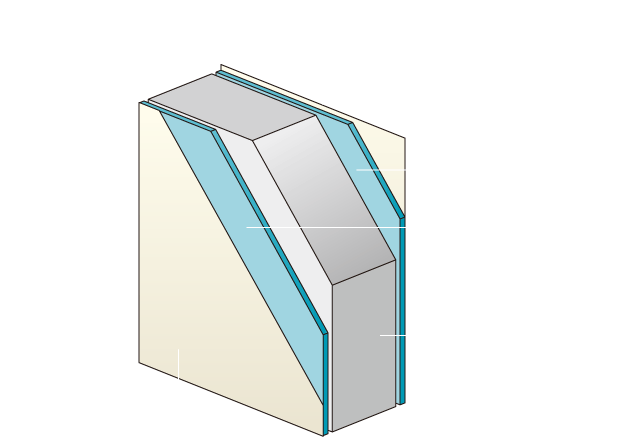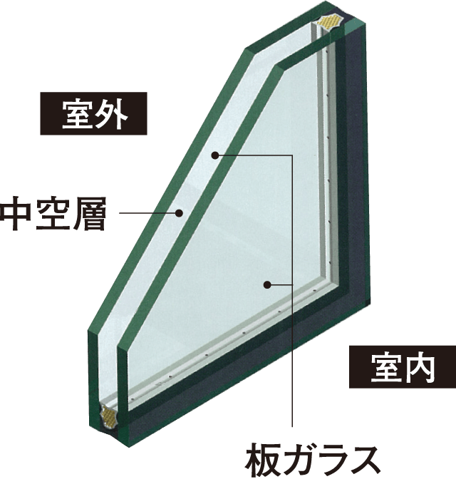 2枚のガラス間に空気の層を設けた複層ガラス。この中空層により、熱伝導をカット。高い断熱性とともに、空調機器のエネルギーロスを抑える効果が得られます。(一部ガス入りあり)