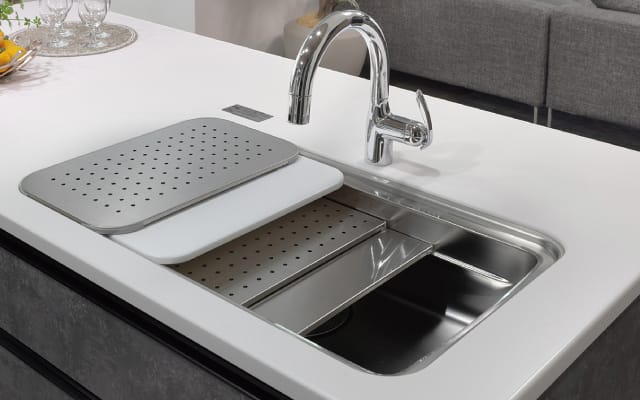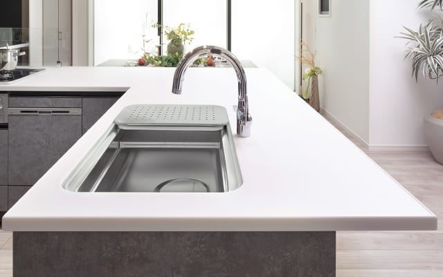 シンクを三層構造にすることで、調理や洗い物などの作業を効率的に行えるスペースを設けた多機能シンクです。(一部オプションあり)