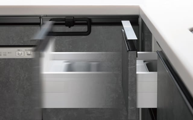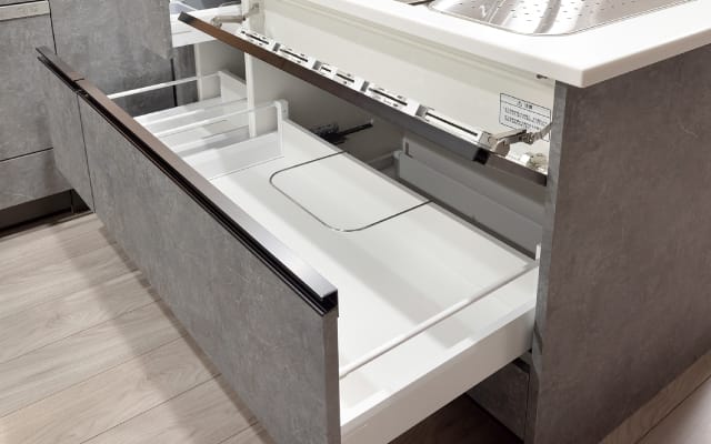 奥の物も取り出しやすい引き出し式の収納。巾木部分の収納に加え、包丁ホルダー(一部オプションあり)も便利です。