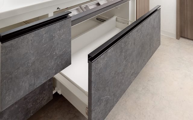 化粧台下部は、タオルや小物など、奥の物もサッと取りだせる引き出し式の収納です。