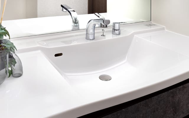 清潔で美しい人造大理石のワイドな洗面カウンタートップ。継ぎ目のない一体成型なので、お掃除も簡単です。