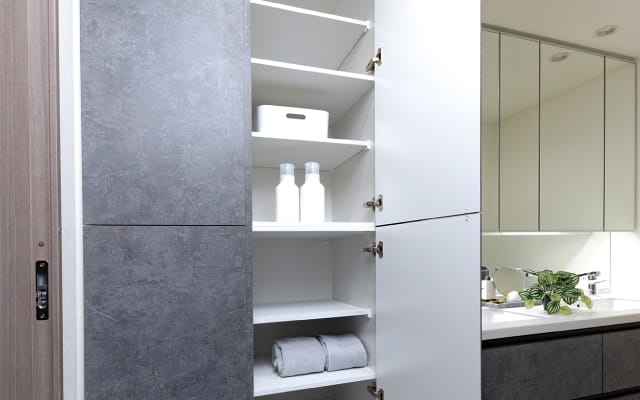 タオルや衣類等、ストックしたものが確認しやすく、取り出しやすい洗面室収納です。