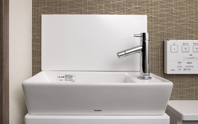 トイレ本体から手洗いを独立させた、清潔で使い勝手の良い手洗い付きキャビネット。下部はスリムな収納となっています。