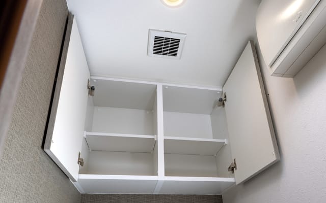 スペースを有効活用した吊戸収納。洗剤などのストック類をスッキリ収納します。