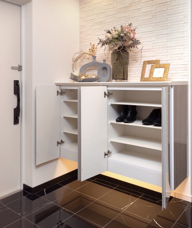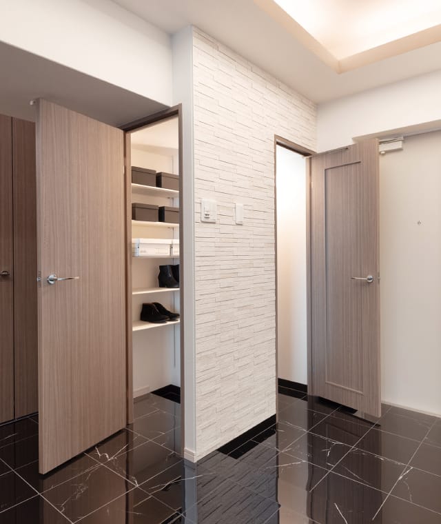 玄関内には、人の動きを感知して自動的に点灯する人感センサーライトを採用しました。