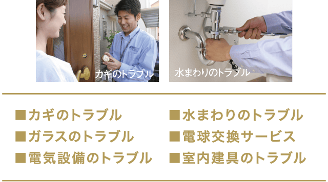 暮らしの様々なシーンで起こるトラブルや緊急時のお困りごとに、専門知識を持ったスタッフが迅速に対応。日々に安心で便利なサポートをご提供します(一部サービスは有料)。