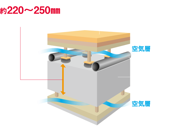 床構造には約220〜250㎜(水まわりは除く)のコンクリートボイドスラブ(中空スラブ)を含めた二重床・二重天井構造(一部除く)を採用しています。