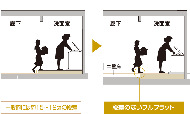 些細な段差が原因で、つまずきや転倒などが起こってしまう。そんな危険を解消するために、水まわりの配管スペースを二重床に。居室や廊下など住戸内に床段差のないフルフラット設計を採用しました。お掃除もスムーズです。