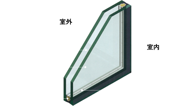 2枚のガラス間に空気の層を設けた複層ガラス。中空層の空気により熱が伝わりにくいため、高い断熱効果が得られます。また、結露の発生も抑制します。(一部Low-E複層ガラスを採用、一部ガス入りあり)