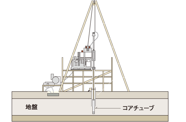 地盤は場所ごとに性質が異なるため、建築前に標準貫入試験を行い地盤の強度分布を測定。N値(強度の目安)を求め、地層分布を調査します。これらのデータをもとに、適切な基礎設計を行います。