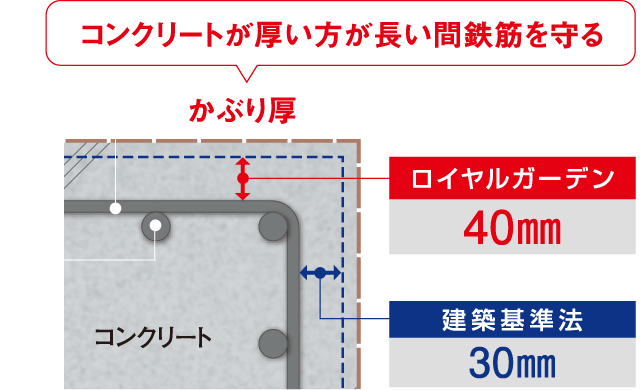 建物の耐久性を維持するためには、湿気や雨などによる鉄筋の錆を防ぐ必要があります。そのために鉄筋をアルカリ性のコンクリートでガードし、保護しています。このコンクリートの厚さを「かぶり厚」といい、ロイヤルガーデンでは建築基準法(30㎜)を10㎜上回る40㎜を最低基準に設定(外部に面する部位)しています。