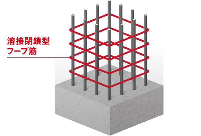 溶接閉鎖型フープ筋とは、あらかじめ工場でフープ筋を溶接することによって、一体性をもたせて主筋を束ねるもの。一般のフープ筋に比べ、コンクリートの拘力を高めて、耐震性能を向上させます。※一部、高強度せんだん補強筋を採用。