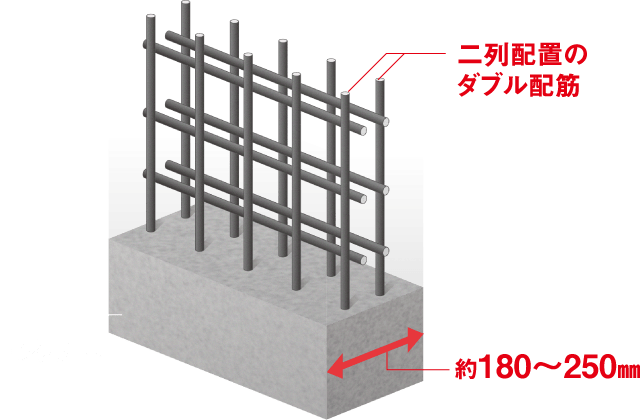 主要な壁面には、コンクリート内の鉄筋を二重に組んで配置したダブル配筋施工を実施。シングル配筋に比べて高い強度を発揮し、建物の優れた耐久性を保ちます(非耐力壁は除く)。