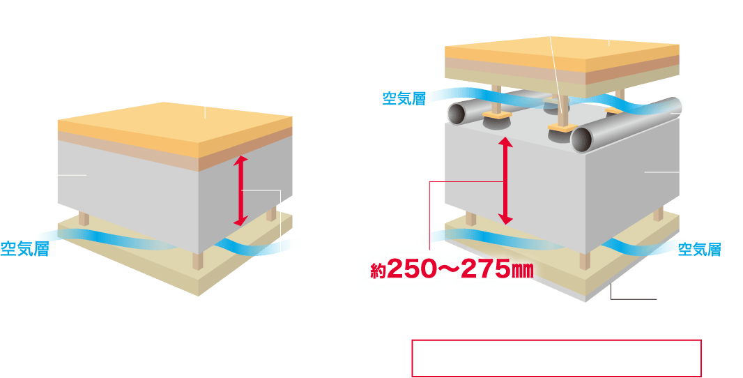 床構造には遮音性の高い約250〜275㎜(水まわりは除く)のコンクリートボイドスラブ(中空スラブ)を採用しています。