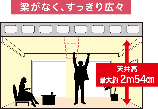 ※リビング・ダイニング一部直貼(最上階は二重天井)室内の小梁を解消するボイドスラブ工法を採用。住戸内の天井面がフラットになり、すっきり広々とした空間を実現します。また、リビング・ダイニングは折上天井を採用。天井を高くすることで空間の広がりを演出します。