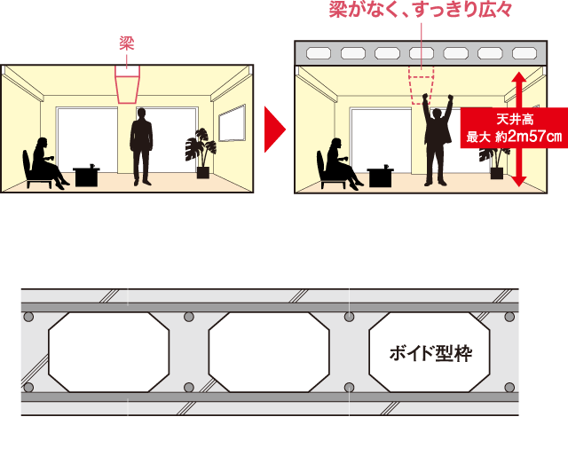 床構造には約220〜250㎜(水まわりは除く)のコンクリートボイドスラブ(中空スラブ)を含めた二重床・二重天井構造(一部除く)を採用しています。