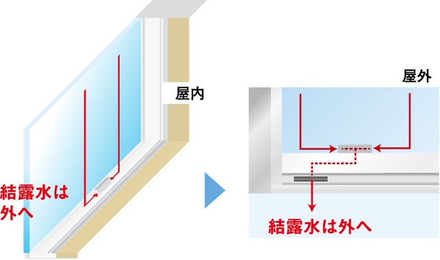 冬場の暖房時に発生しやすくなる窓の結露。カビの発生の大きな原因となります。これを抑制するために、サッシには結露受けを設け、水滴を外に排出します。※一部機材には結露受けがありません。換気が必要です。