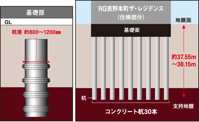 基礎構造には『既製コンクリート杭』を採用。直径約800〜1200㎜の杭を合計30本、地中約37.55〜38.15mの深さの支持層まで打ち込み、地盤への支持力をもたせています。